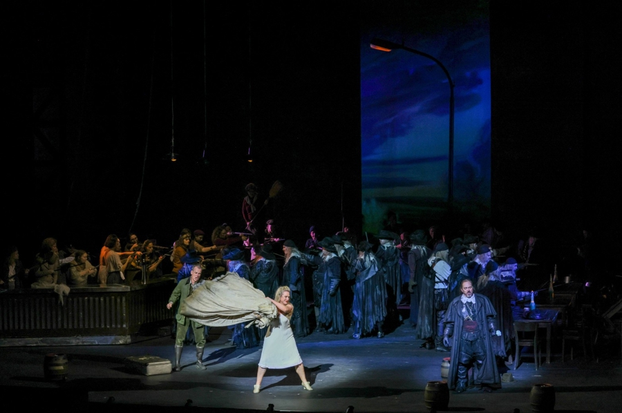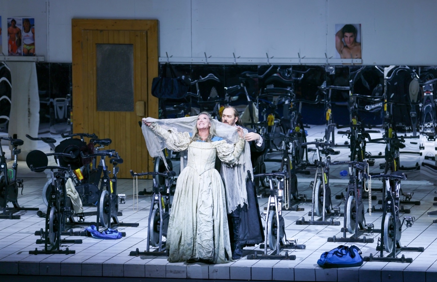 尤洛夫斯基钦佩康维奇尼干脆地甩开“爱情”和“女性牺牲”的包袱,在现代主义的维度中重新丈量女主角森塔和浪漫主义的精神强度。幽灵船长“荷兰人”是给普通人的秩序带来威胁的人,也是挑战命运的英雄,这在今天是不需要讨论的。这个悲剧的关键在森塔。第二幕从纺纱变成健身房,这不是猎奇的当代化演绎,也不是利用“纺纱”和“动感单车”是同一个单词的文字游戏。这场戏的核心没有变,就是森塔和身边世界格格不入。她不在乎猎人埃里克的追求,她和向往爱情的女孩们没有共同语言,她有着那些人不能想象和理解的精神世界。森塔能够共情荷兰人,渴望迎击命运的风浪,他俩是践行浪漫主义的勇敢者。与两人形成对比,森塔的父亲、照顾她的玛丽、爱慕她的埃里克以及纺纱姑娘们,这些人简单且庸俗,他们和主角不在一个世界。尤洛夫斯基强调,导演敏锐地把握住瓦格纳的主角在精神层面凌驾于庸众,以此激烈批判渗透于欧洲当代生活的平庸和务实:“即使浪漫主义的价值观被认定过时,康维奇尼仍然有能力让当代观众在瓦格纳的音乐中辨认出自我,然后为此坐立不安,这是他了不起的地方。”