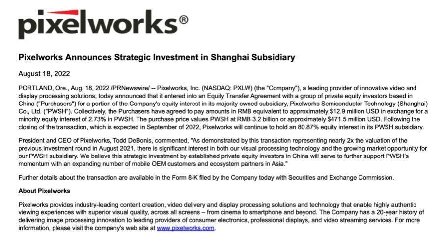 2022年8月,Pixelworks再度宣布已与一组中国私募股权投资者就PWSH的部分股权签订了股权转让协议。收购方合计同意支付约1290万美元,以换取PWSH的2.73%股权。此次收购对PWSH的估值为32亿元人民币。
