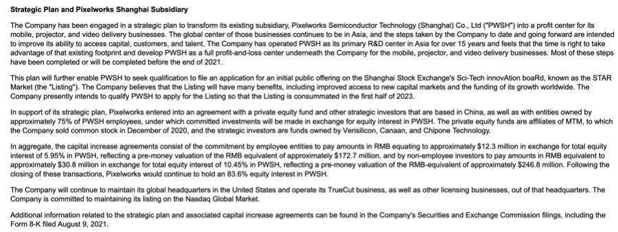 2021年,Pixelworks宣布对上海研发中心(PWSH)的重组计划,旨在加速将PWSH转型为其移动、投影仪和视频传输业务的利润中心,因为这些业务的全球中心在亚洲。彼时公司方面披露,希望让PWSH有资格在2023年上半年在中国科创板进行IPO。